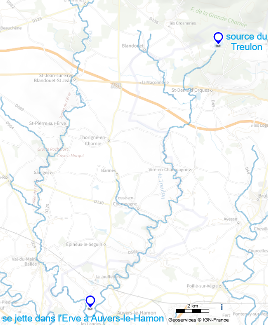 La rivière prend sa source dans la forêt de la Grande-Charnie, sur la commune de Torcé-Viviers-en-Charnie en Mayenne (photo).